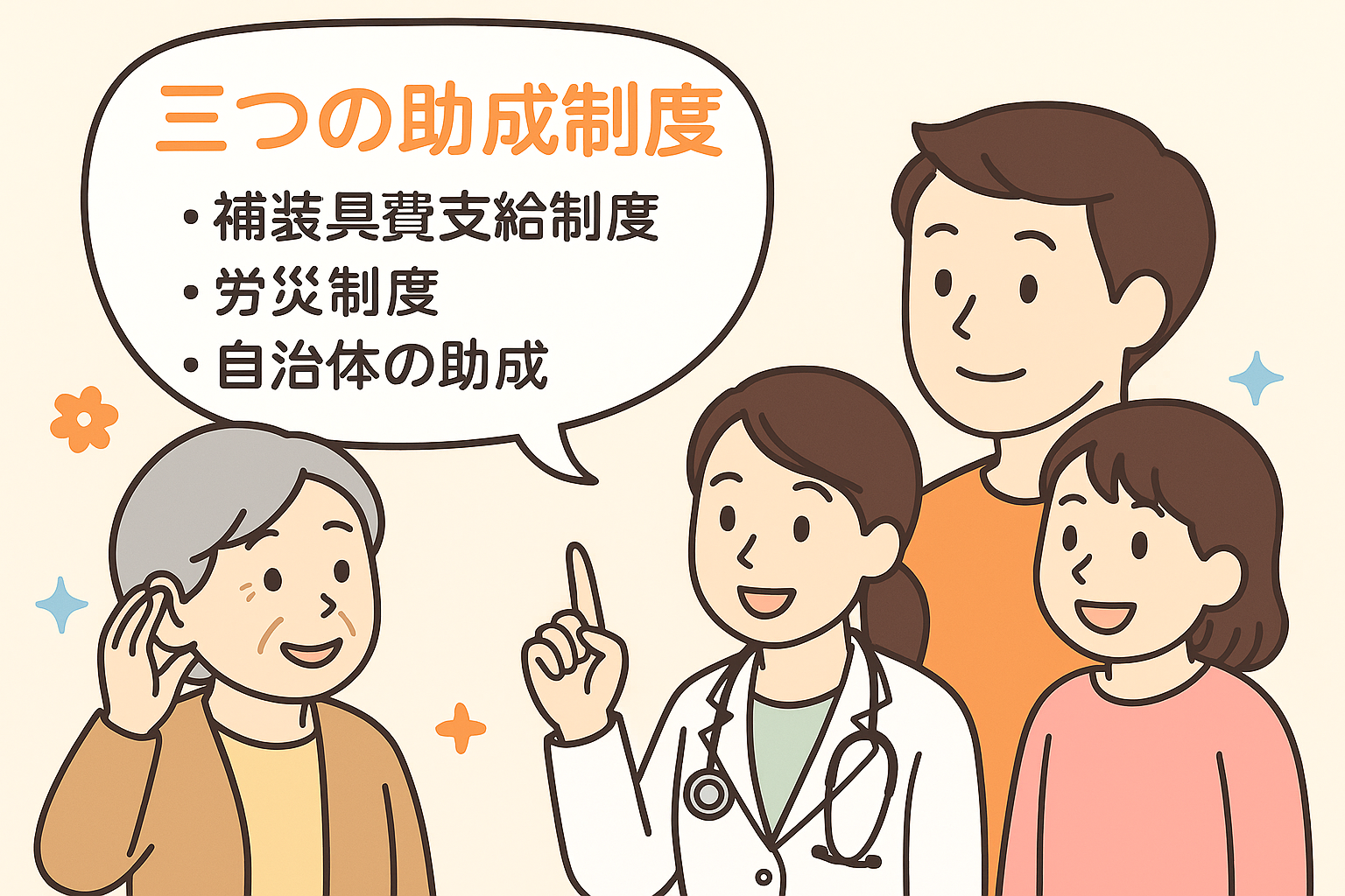 医師(補聴器相談医=補聴器に詳しい耳鼻科医): 「こんにちは。お母さまのお聞こえチェックと、補聴器が必要となった場合ののご相談ですね。事前に娘さんから質問頂いていた件ですが。実は三つの助成制度があるんですよ。まず、お母さまの難聴の程度によっては障害者手帳を取得して補装具費支給制度が使えます。これは補聴器代の9割程度が公的負担となる制度です。」