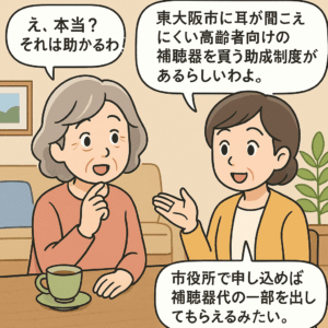 娘さん: 「例えば大阪市では65歳以上で一定の難聴なら補聴器代を最大2万5千円補助してくれる制度があるの。住んでいる地域にも似た制度があるか、市役所に問い合わせてみましょう!」
