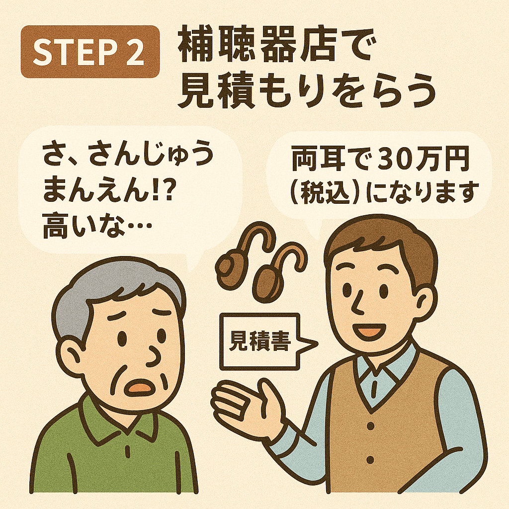 ※見積書とは、「どの補聴器をいくらで買う予定か」を書いた用紙紙。この制度では補聴器を買う前に見積書をもらっておくことが必要です。