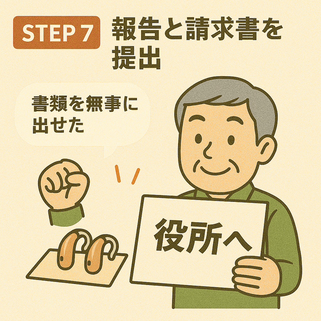 補聴器を買ってしばらく経ったら、男性は最後の手続きを行う必要があります。市役所にお金をもらうための書類(請求書類)を出すのです。そこには次のようなものがあります。