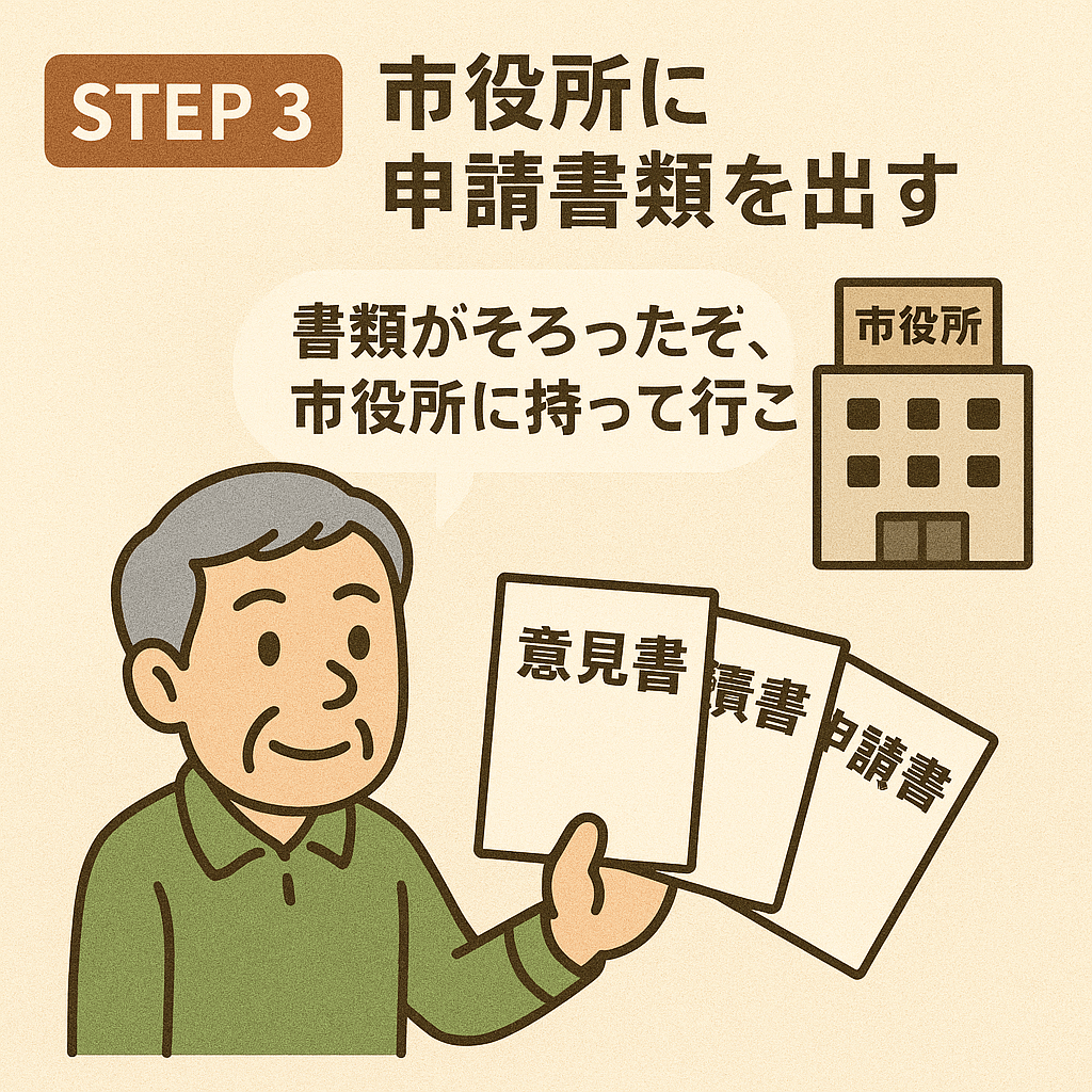- 男性: 「はい、先生の意見書とお店の見積書、それに申請書があります。お願いします。」
