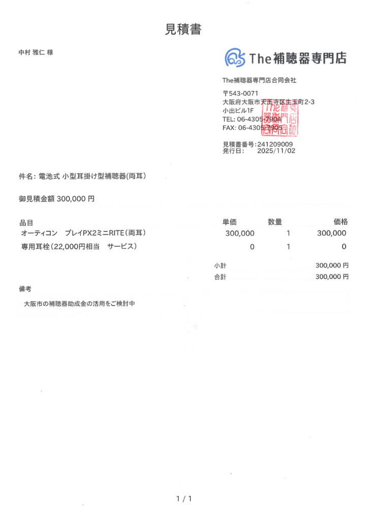 - 店員: 「こちらの補聴器ですと、だいたい30万円くらいになります。大阪市の助成金を申請するには【見積書】が必要なので、これをお渡ししますね。」 (※毎年発表されている【補聴器工業会】の出荷金額を元に計算すると、市場平均価格は両耳24万円~30万円と言われています)