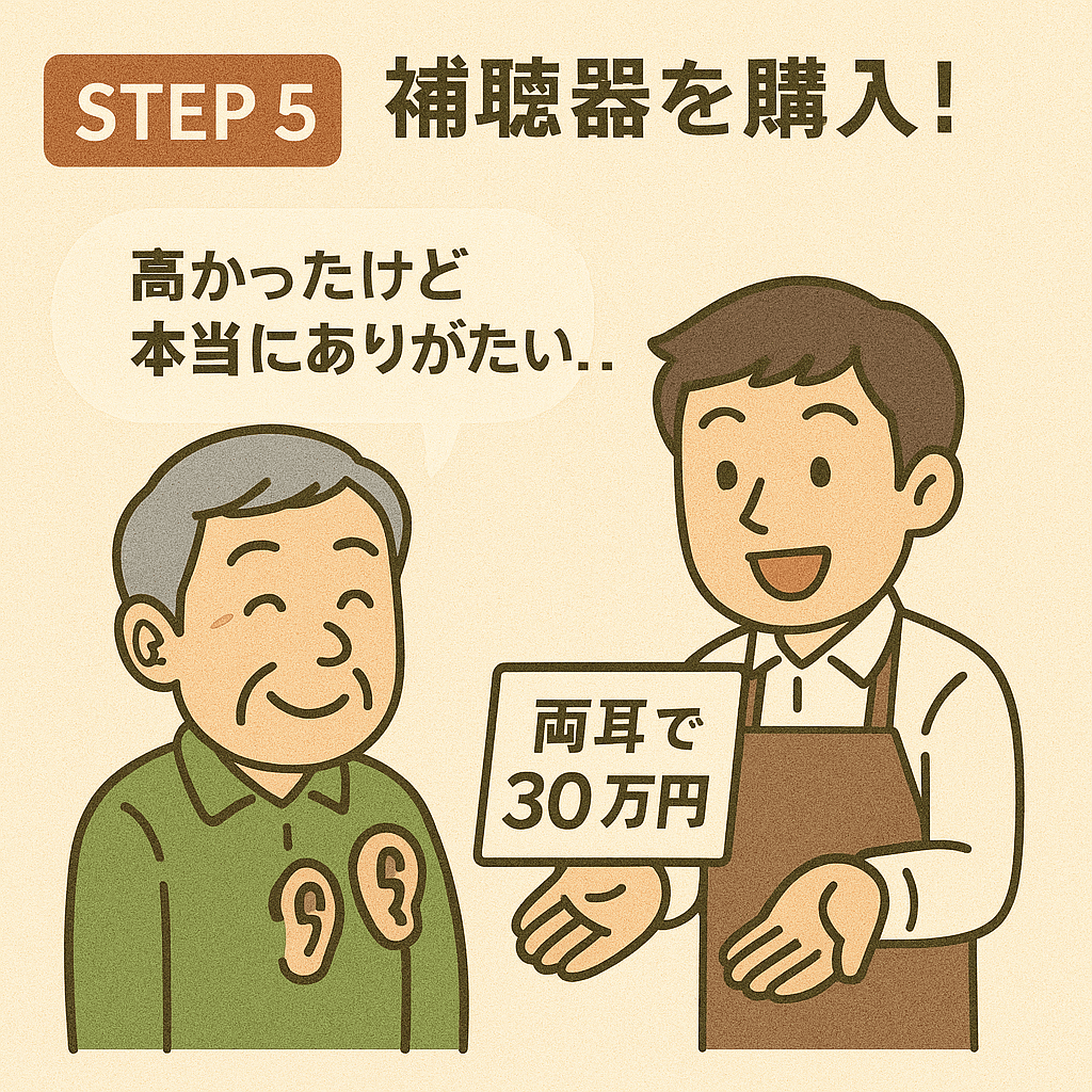 通知書を受け取った男性は、いよいよ補聴器を購入しに行きます。ステップ2で見積もりをもらったお店で、その補聴器を注文することに。