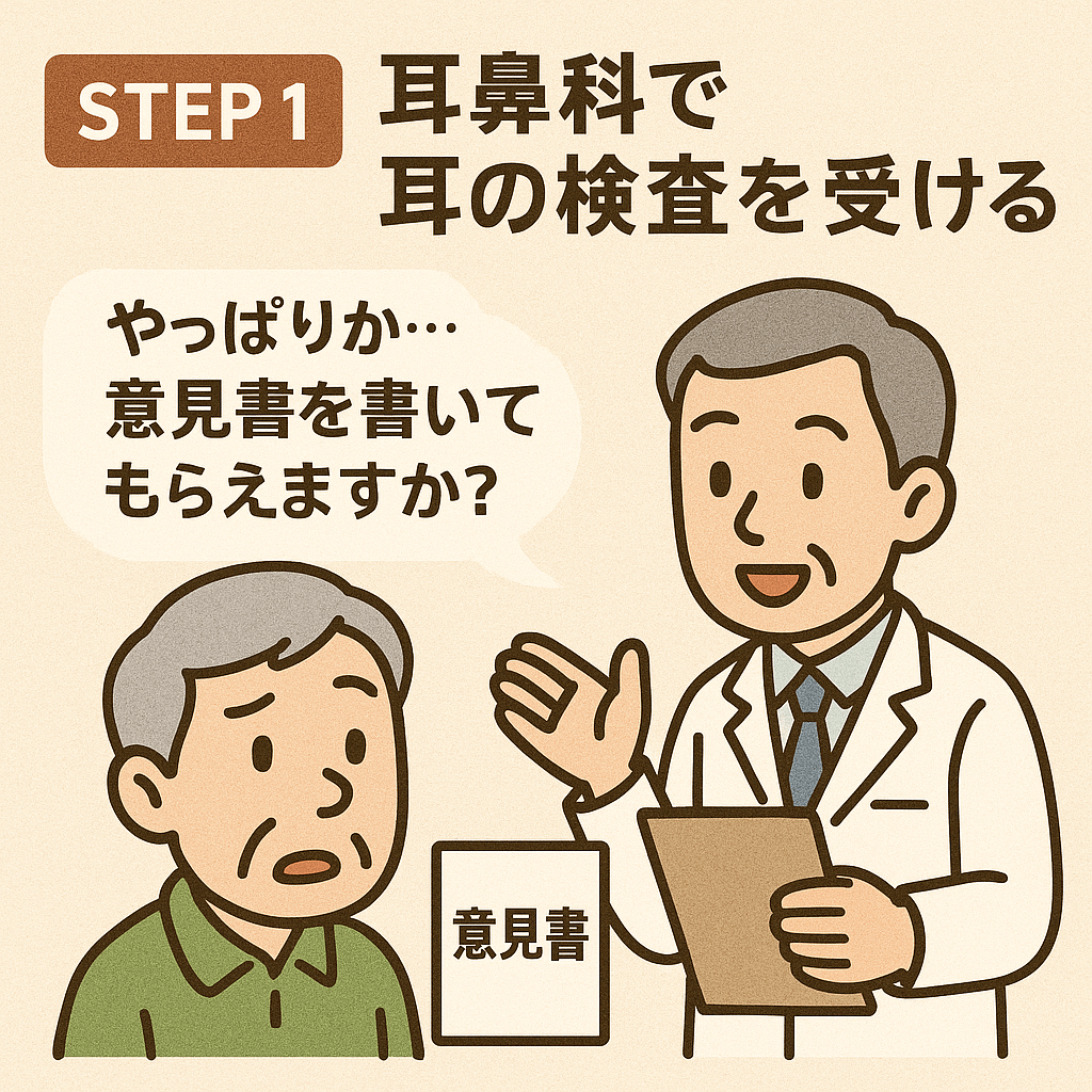- 耳鼻科: 「補聴器を使うともう少し楽に聞こえるようになりますよ。補聴器が必要だという意見書を書きますね。」