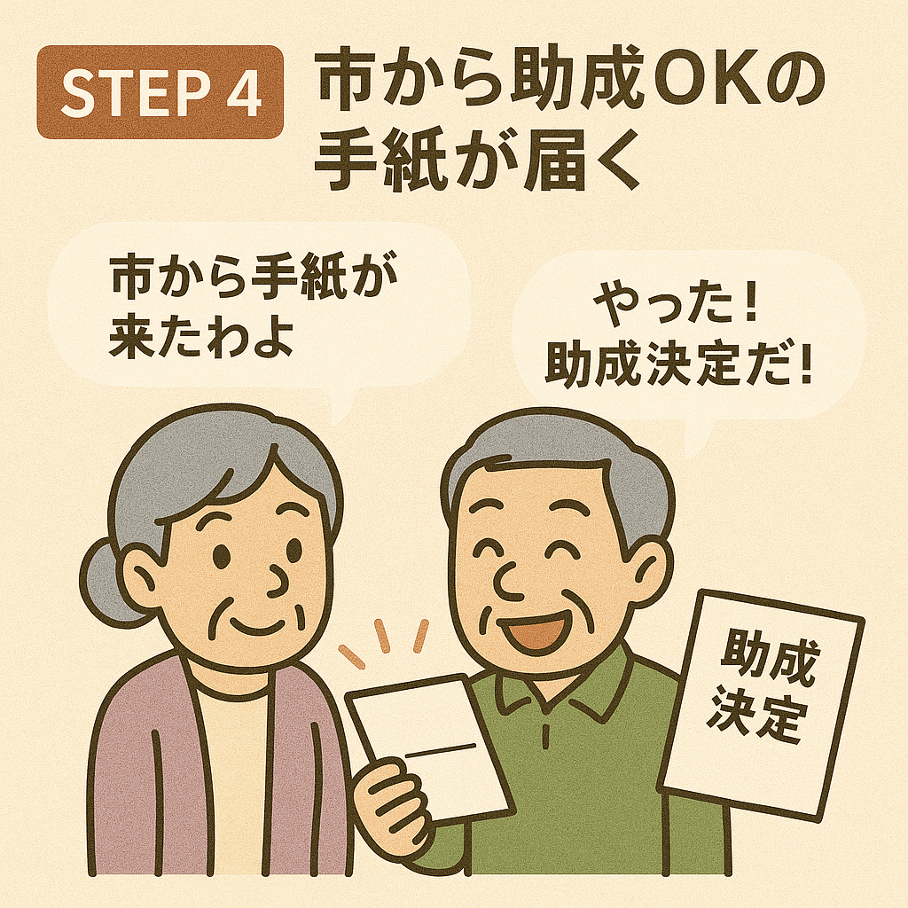 - 審査・通知 – 市が内容を審査し、助成対象者として決定された場合は決定通知書が郵送されます