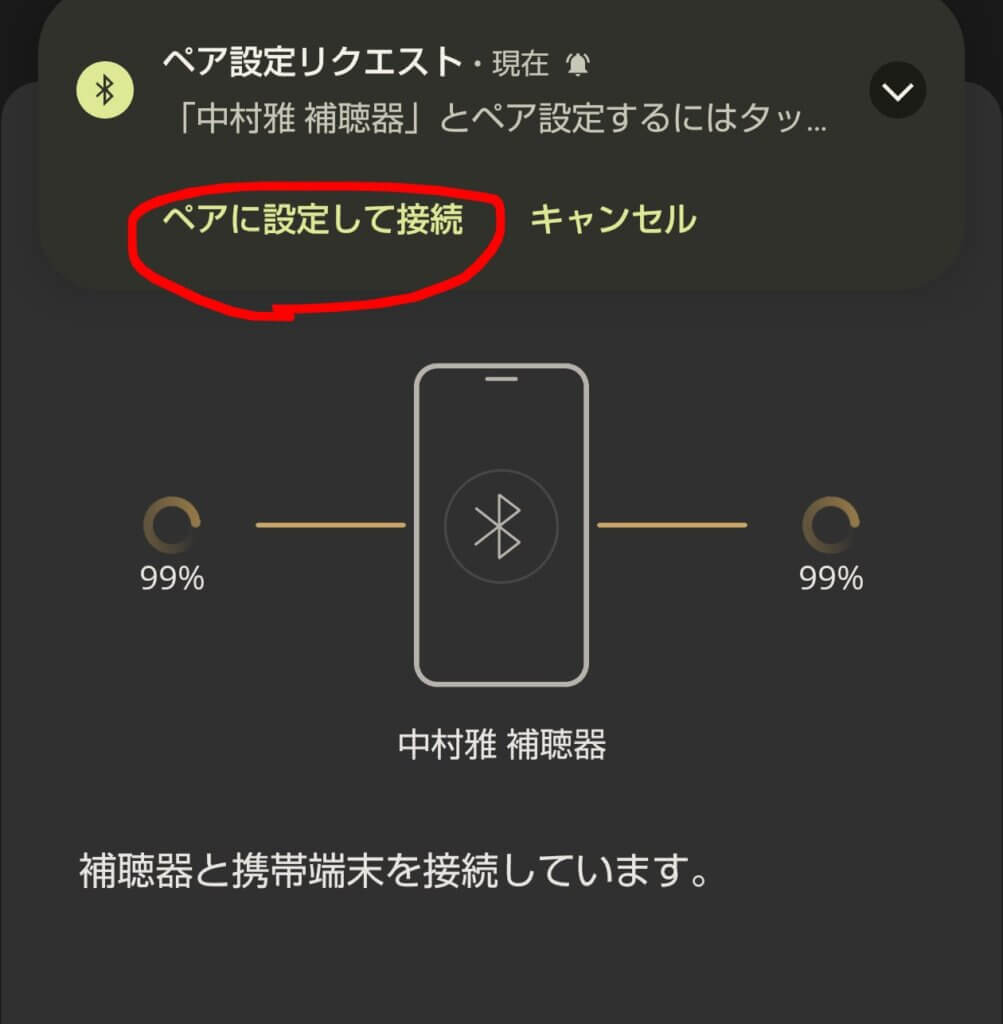⇒ ペア設定リクエストの表示が出たら、すかさず、「ペアに設定して接続」をクリックして下さい
